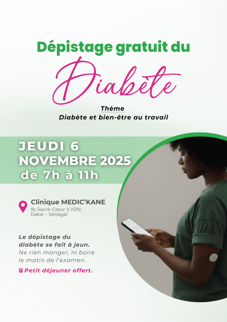 À l’occasion de la journée mondiale du diabète, La clinique MEDIC’KANE organise une journée de dépistage gratuit du diabète le Jeudi 6 Novembre 2025 de 7h à 11h. Si vous serez présent, merci de bien vouloir remplir les informations suivantes.